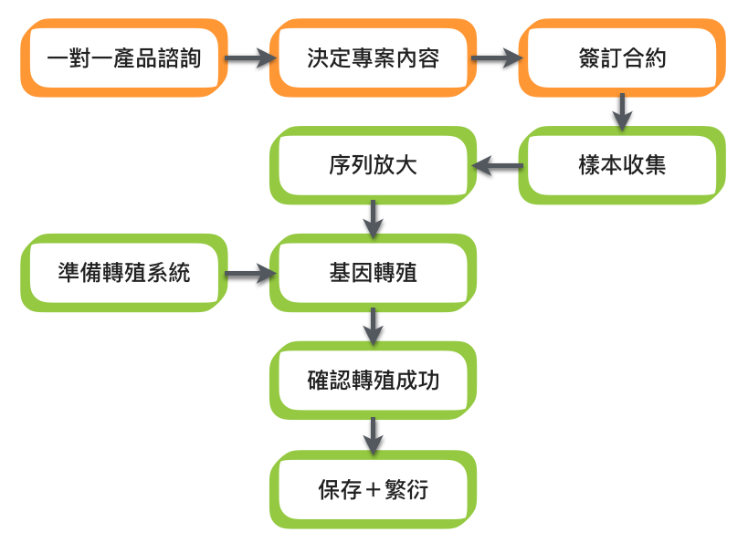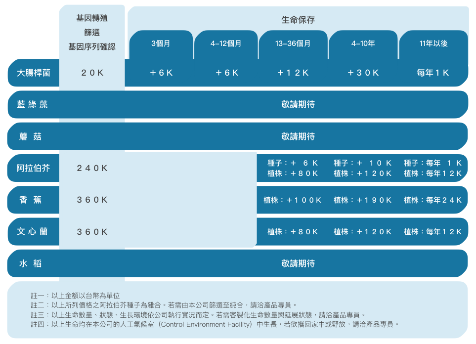 目前生命延展服務所涵蓋的轉基因生物(Genetic Modified Organism, 簡稱GMO),已經完全進入商業運轉的僅有大腸桿菌、阿拉伯芥、香蕉、文心蘭等四種,接下來將陸續正式推出其他物種。所有技術面上的方法選擇,由本公司依照執行當下的技術發展與公司設備做調整。